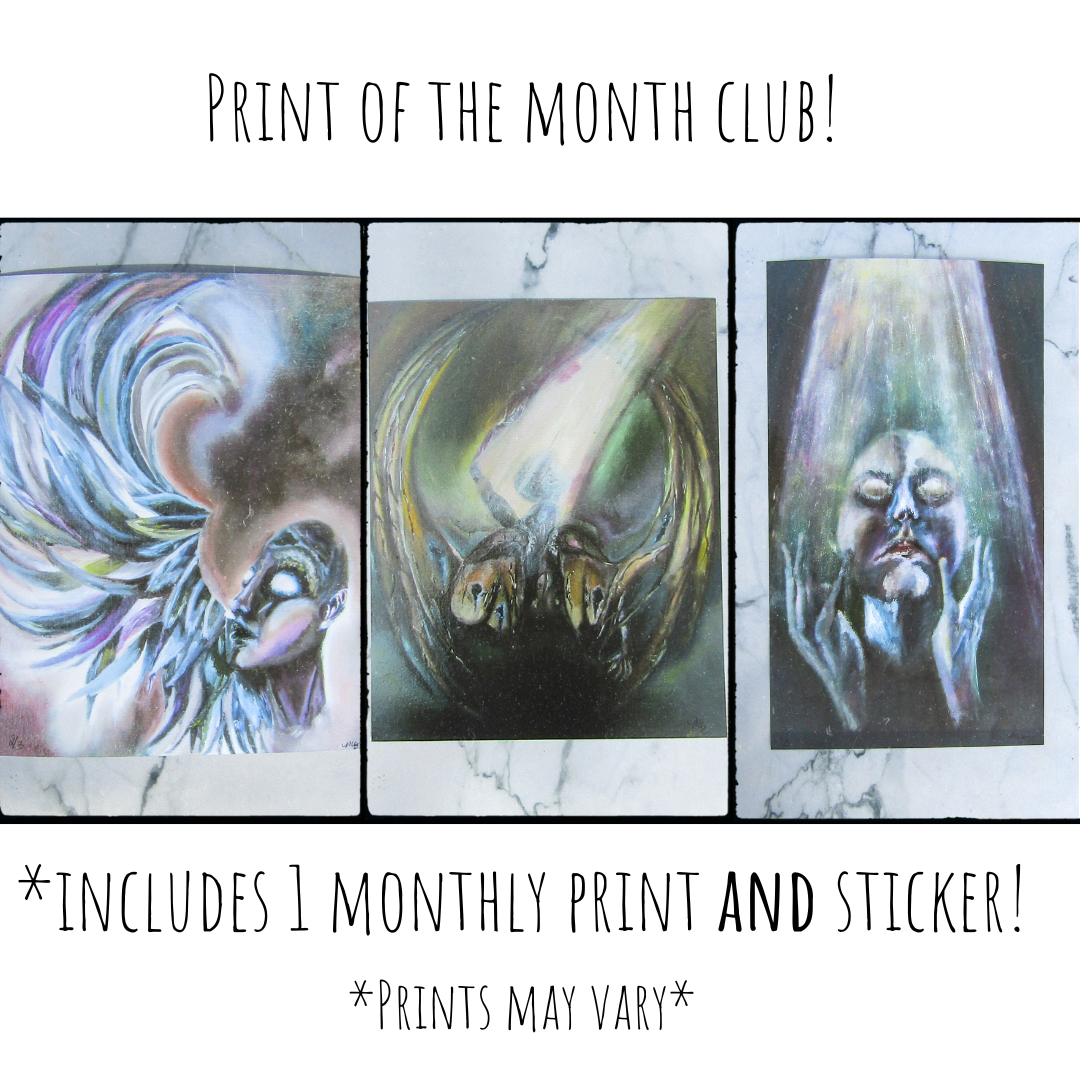 Newly released as part of the “Story Collection”, we are now offering Subscription options such as “Print of the Month” and “Sticker of the Month”, as well as mystery packs and bundles that make amazing gifts for the dark art lover in your life! (that includes you!)